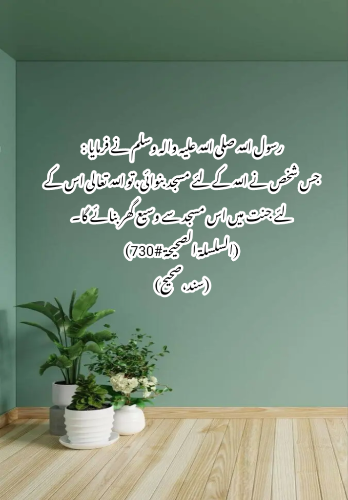رسول اللہ صلی اللہ علیہ والہ وسلم نے فرمایا :جس شخص نے اللہ کے لئے مسجد بنوائی، تو اللہ تعالی اس کے لئے جنت میں اس مسجد سے وسیع گھر بنائے گا۔(السلسلة الصحیحة #730)(سند،صحیح). Hadees shareef